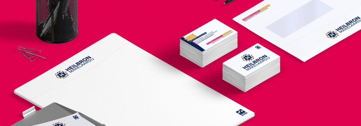 De introductie van een aangepast logo is ook het ideale moment om de bijbehorende huisstijldragers onder de loep te nemen. Bij lekker in vorm ontwierpen we daarom voor Heilbron & Heilbron Makelaardij nieuwe visitekaartjes, briefpapier (om zelf te printen via facturatiesoftware) en enveloppen in uniforme stijl.