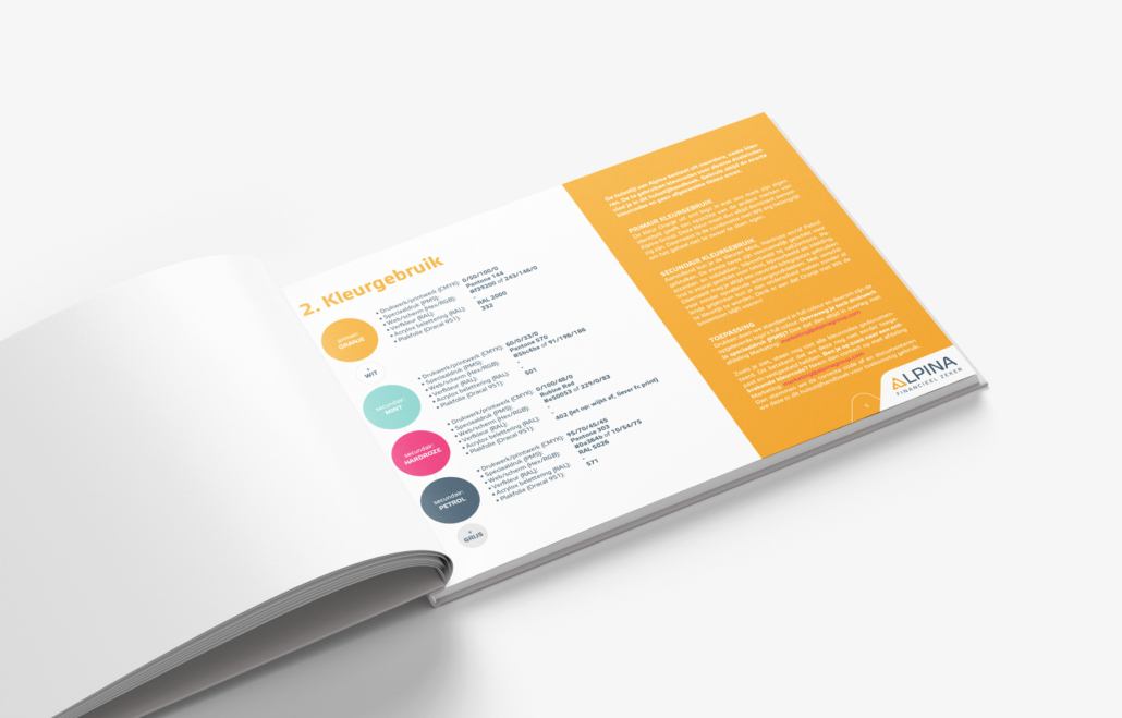 In dit overzichtelijke huisstijlhandboek vind je alles wat je als werknemer of leverancier van Alpina moet weten over de huisstijl, van tone-of-voice tot kleurgebruik. Het is handig in digitale vorm beschikbaar en kan dankzij de enkelzijde A4-opmaak makkelijk zelf geprint worden.
