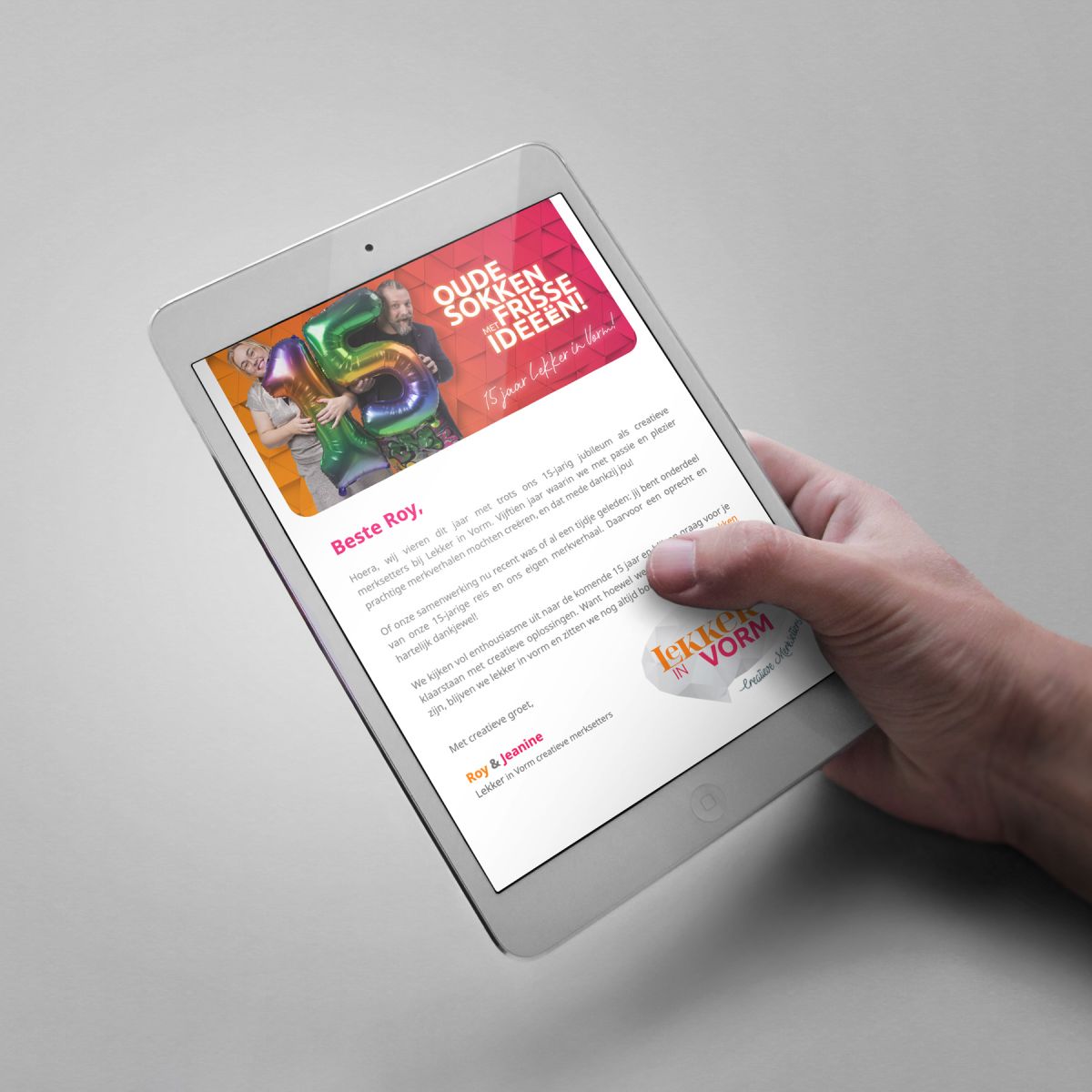Om ons 15-jarig jubileum dit hele jaar door te vieren, voeren we naast een jubileumlogo de jubileumcampagne Oude Sokken met Frisse Ideeën. Onze klanten werden natuurlijk als eerste op de hoogte gesteld.