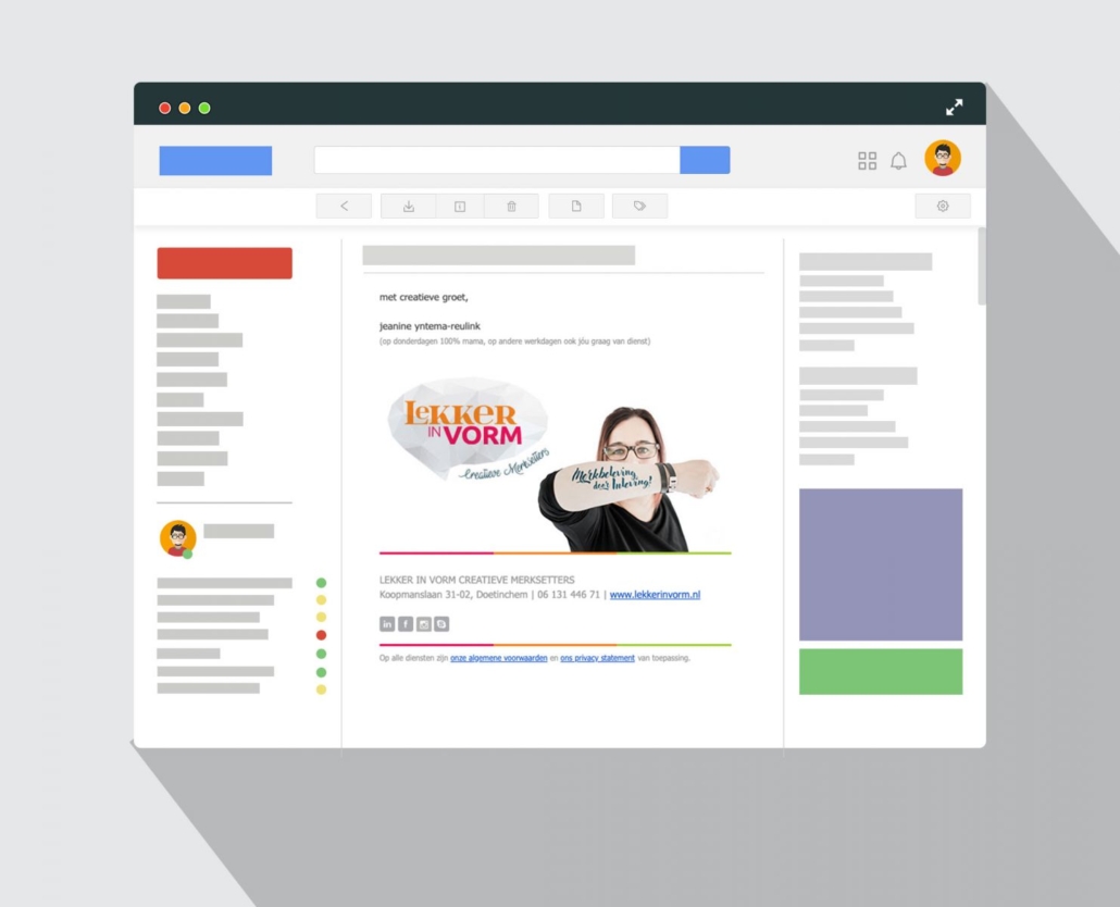 Een eenvoudige maar verzorgde e-mailhandtekening met foto past goed bij het persoonlijke karakter van ons bedrijf. Tijdens het jubileumjaar hebben de gewone versies tijdelijk plaatsgemaakt voor jubileumversies met geanimeerd jubileumlogo.