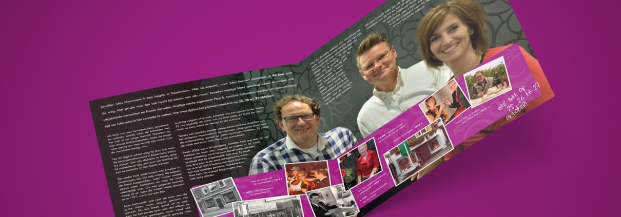 Juwelier Jules Moormann is een begrip in Doetinchem. Niet zo vreemd, want Jules timmert inmiddels al 40 jaar aan de weg. Met passie voor het vak heeft hij samen met zijn vrouw Annelies menige klant gelukkig weten te maken met uitgekiende uurwerken en fraaie sieraden. Huidige mede-eigenaren Paul & Ascelina Schotanus vonden het daarom hoog tijd om Jules eens in het zonnetje te zetten, via een jubileumweekend met een feestelijke jubileumcheque en deze jubileumfolder.
