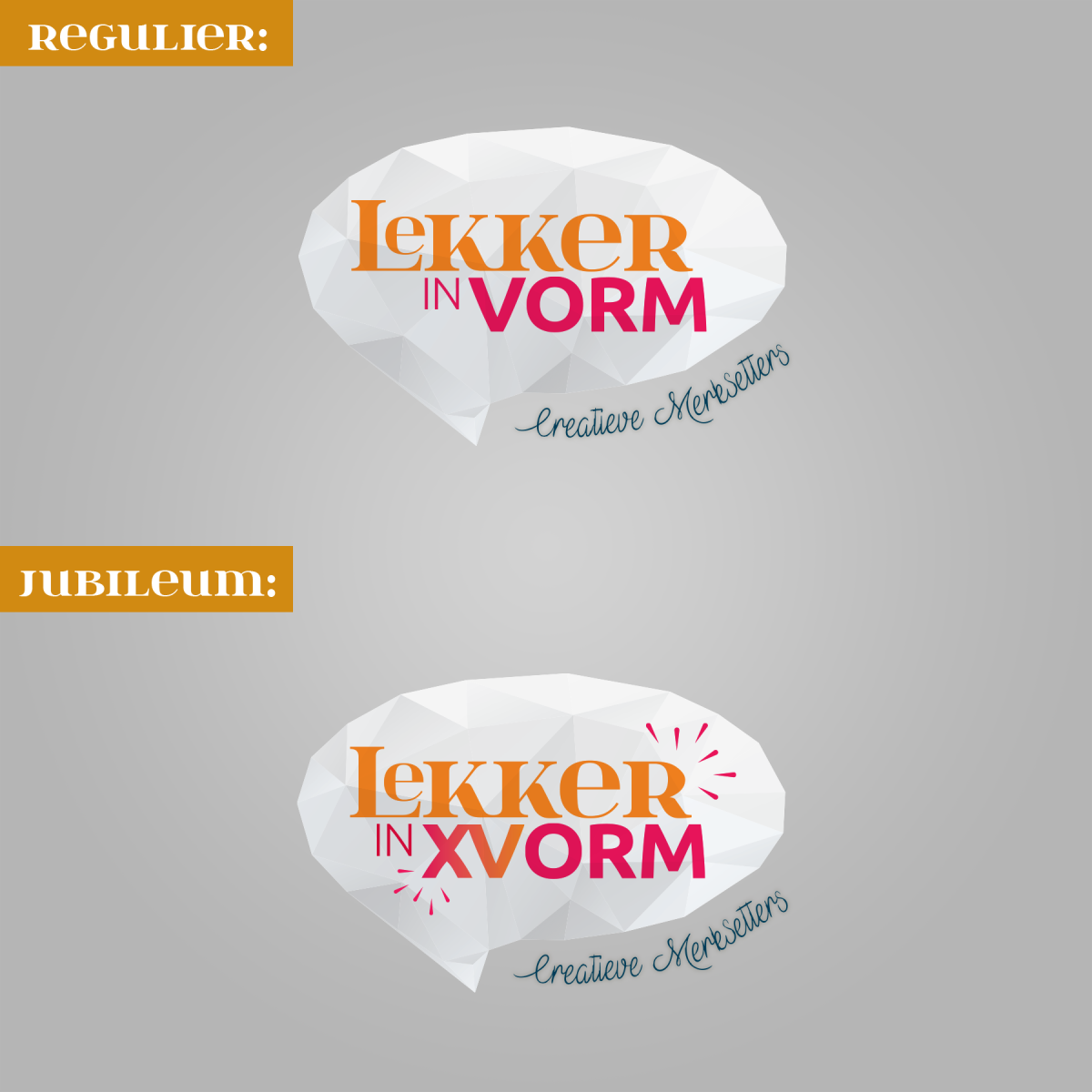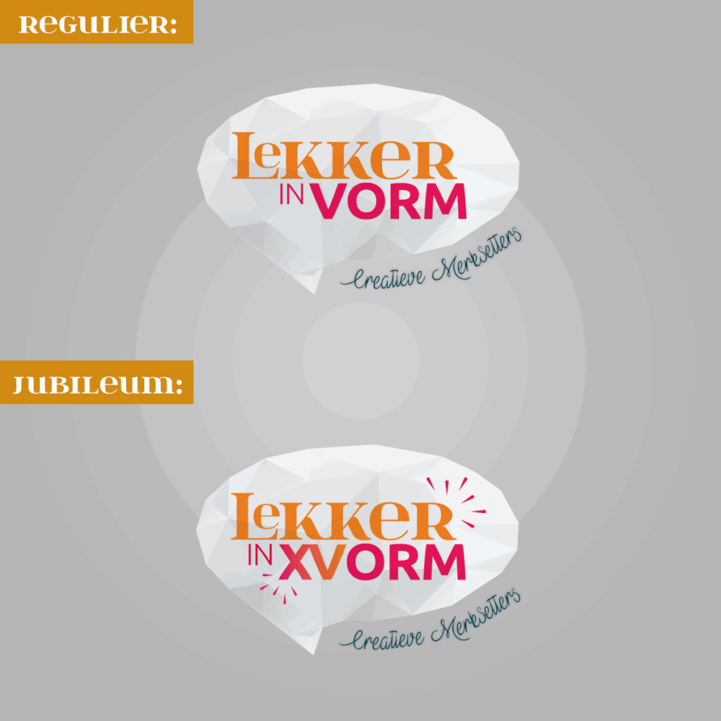 Bij lekker in vorm mogen we dit jaar 15 kaarsjes uitblazen! Dat laten we natuurlijk niet ongemerkt voorbijgaan. Speciaal voor dit feestjaar voeren we een jubileumlogo met spranekelend vuurwerk en de Romeinse cijfers XV erin verwerkt. Waar mogelijk, is het logo een geanimeerde gif voor extra opvalwaarde.