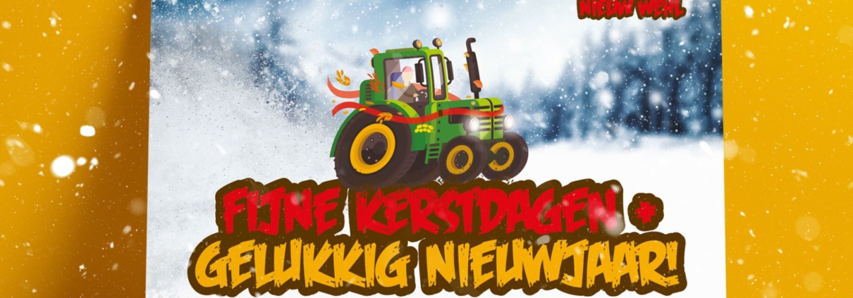 Trekkertrek Nieuw Wehl vindt in de zomer plaats, maar de organisatie laat rond de feestdagen ook graag van zich horen via een kerstkaart. Voor de gelegenheid toverden we bij lekker in vorm de opspattende modder uit de huistijl om in opstuivende sneeuw voor een feestelijk wintergevoel.