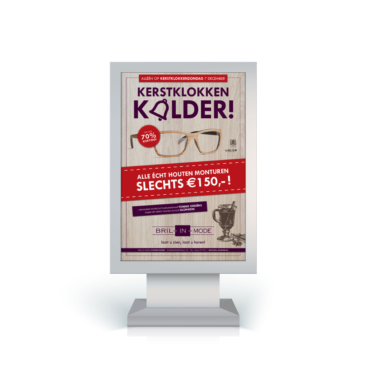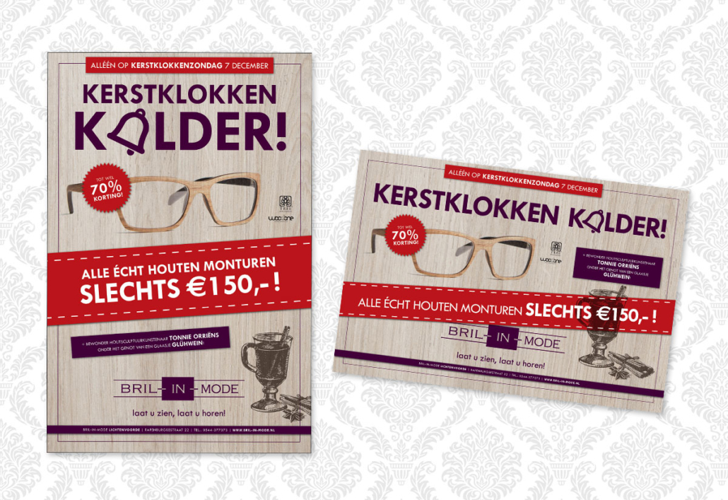 Elke eerste zondag na Sinterklaas is het  Kerstklokkenzondag in Lichtenvoorde. Een evenement dat je niet mag missen. Met elk jaar weer verrassende nieuwe activiteiten, entertainment, muziek en een traditionele kerstmark. Ook het team van Bril-in-Mode Lichtenvoorde maakt er ieder jaar een speciale dag van. lekker in vorm verzorgde de grafische vormgeving van de actie.