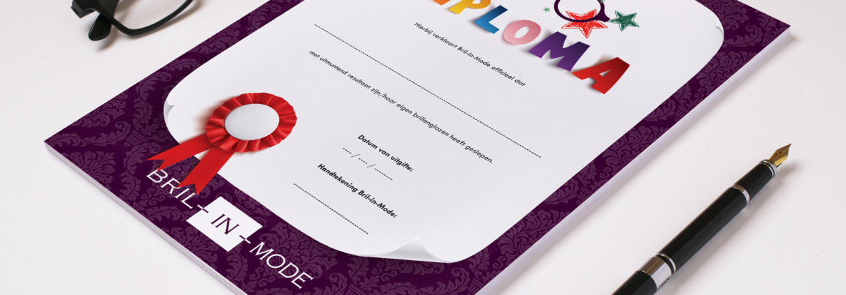 Als junior mag je bij Bril-in-Mode (onder begeleiding) zelf de brillenglazen voor je bril op maat slijpen! Doe je dat succesvol, dan wordt het bekroond met een heus kinderslijpdiploma! lekker in vorm gaf het ontwerp een zowel kleurrijk als officieel tintje.