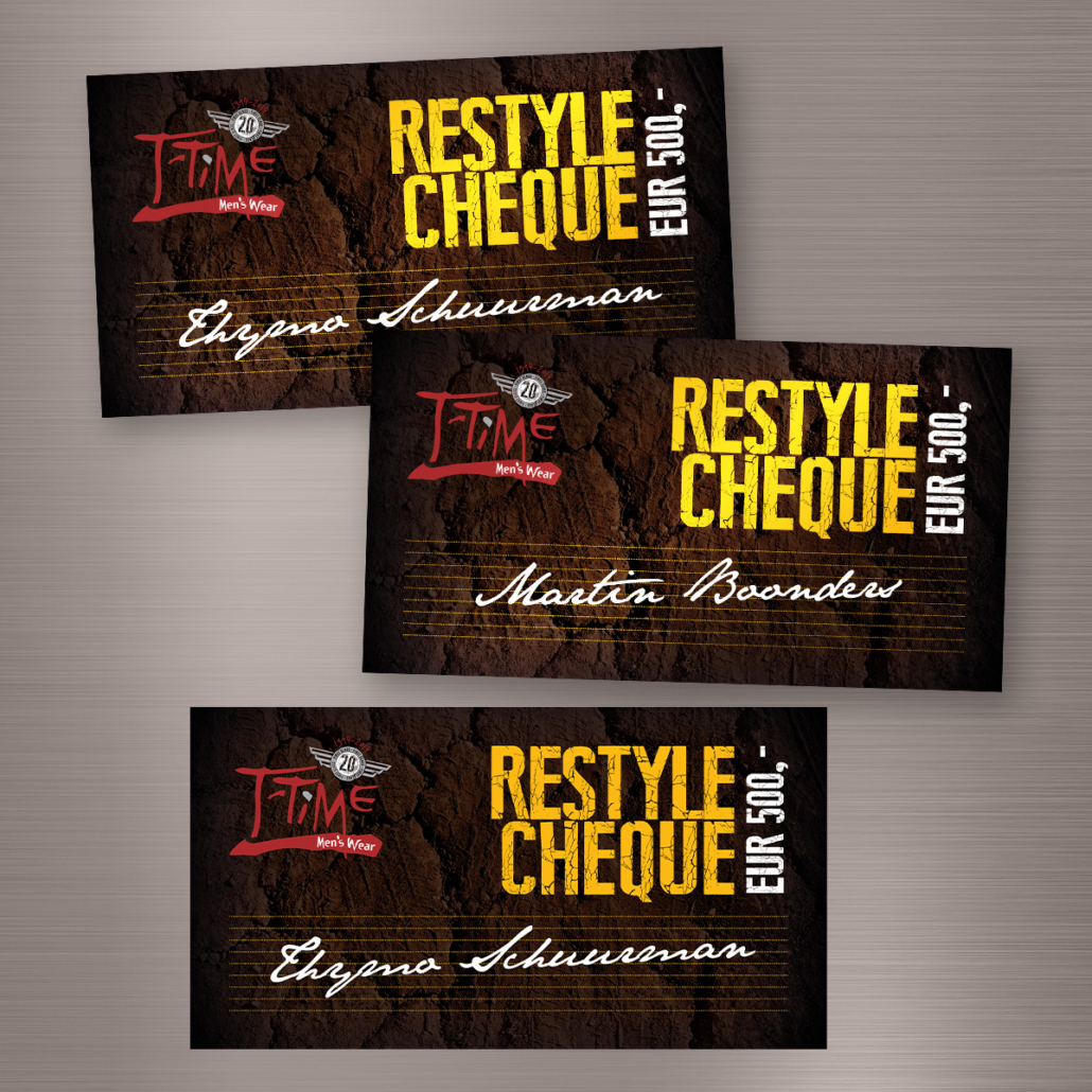Tijdens de knallende jubileumdagen maakten bezoekers van T-Time kans op 1 van de 3 kledingcheques met een restylewaarde van 500 euro per stuk. lekker in vorm verzorgde het ontwerp van de gerpersonaliseerde cheques en schreef na de uitreiking ervan een feestelijk persbericht.