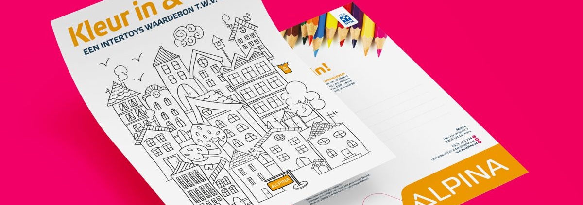 Voor de opening van de nieuwe Alpina makelaardij vestiging in Dronten mochten we bij lekker in vorm het ontwerp maken voor een kleurplaat. We pasten hiervoor een stockbeeld kleurplaat vol leuke huizen aan met diverse Alpina elementen, zodat het geheel toch een maatwerk uitstraling krijgt.