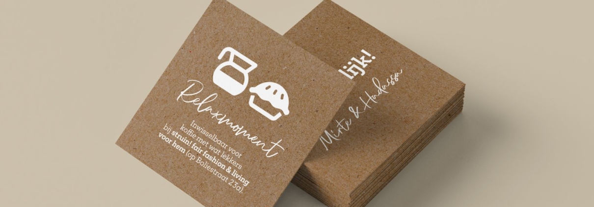 Op Boliestraat 23a servereren ze heerlijke koffie met huisgebakken lekkers bij Struin! fair fashion + living voor hem. Een smakelijke extra incentive om ook dáár eens te gaan struinen. Bij lekker in vorm mochten we voor dit relaxmoment een koffiebon op kraftpapier ontwerpen om onder andere bezoekers aan Struin! fair fashion + living voor haar te verleiden ook even aan de overkant te gaan sfeerproeven.