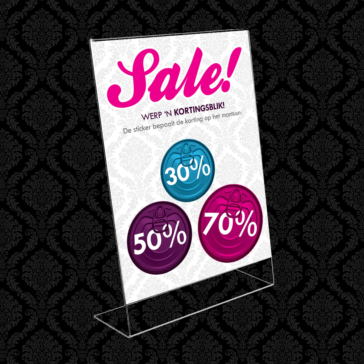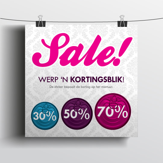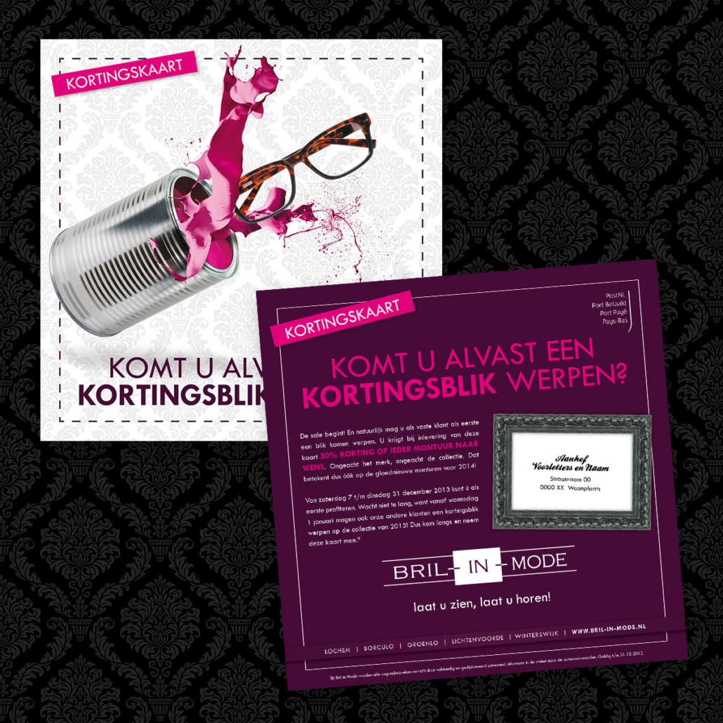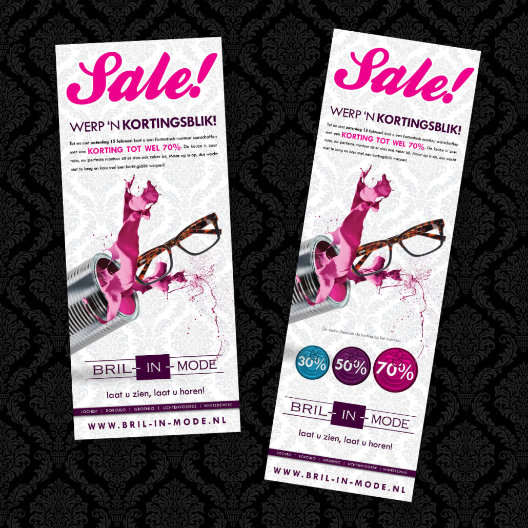 Het is sale bij Bril-in-Mode. De kleur sticker bepaalt de korting op het montuur. De campagne, genaamd ‘werp ’n kortingsblik’ wordt uitgebreid onder de aandacht gebracht middels een direct mailing (presale) naar vaste klanten, huis-aan-huis flyers, advertenties en diverse items in en rondom de winkel.