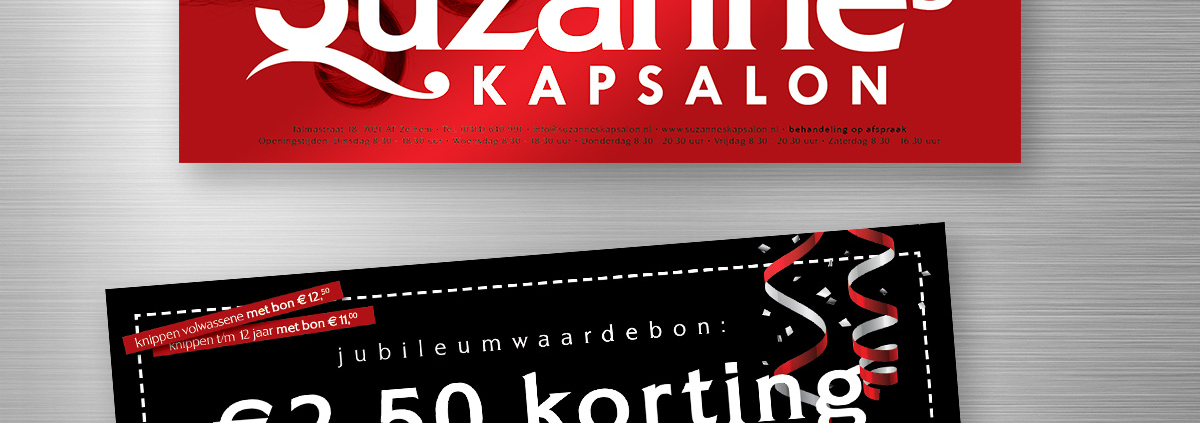 Vanwege het succes van de openingsflyer besloot Suzanne om ter gelegenheid van haar 1-jarig bestaan opnieuw een kortingsflyer te verspreiden. Wederom in het inmiddels herkenbare, langg