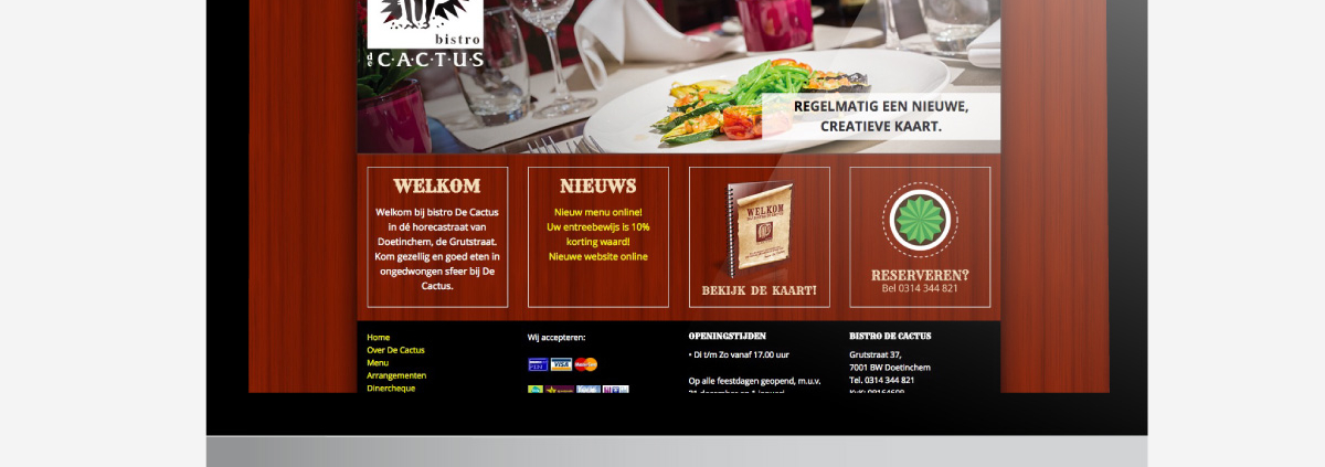 De eerste ‘lekkeropwebsite’ is een feit. De eer is aan Bistro de Cactus. De nieuwe site van dit restaurant is helemaal up to date: niet alleen de nieuwe kaart staat online, maar voortaan is de site ook ideaal te bezoeken via tablet en mobiel. lekker in vorm verzorgde de opmaak binnen de huisstijl en de invulling van de sliders en alle losse items.