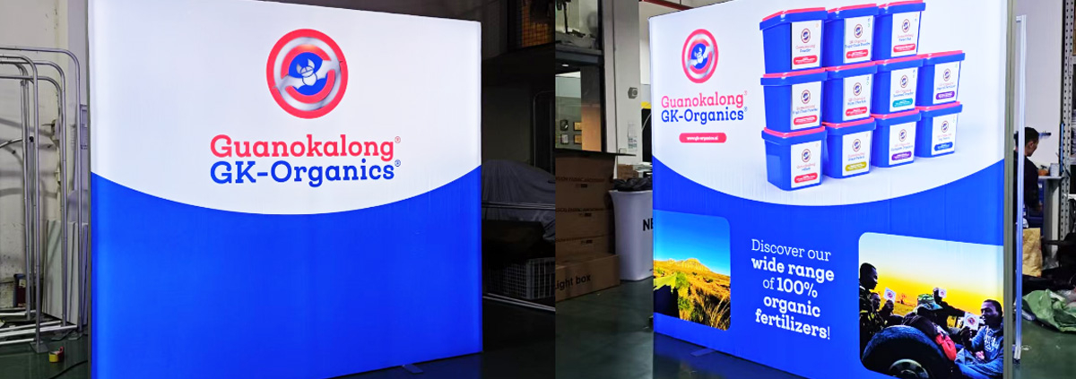 Een beursstand die direct de aandacht trekt? Voor Guanokalong mochten we deze dubbelzijdig bedrukte textiel lichtwanden ontwerpen voor maximale zichtbaarheid en een professionele uitstraling. Dankzij de ingebouwde LED-verlichting komt de boodschap krachtig tot leven, zelfs in drukke beursomgevingen.