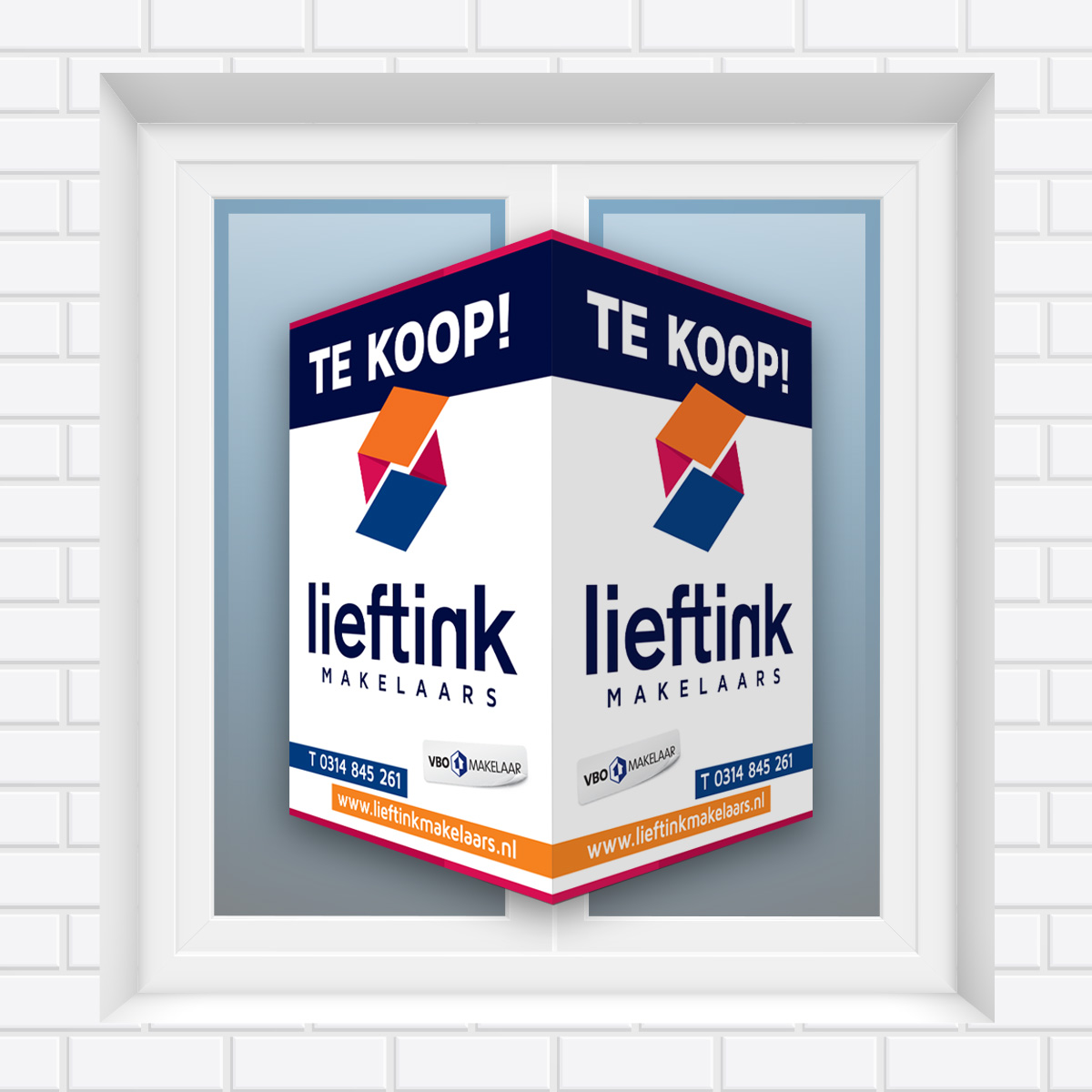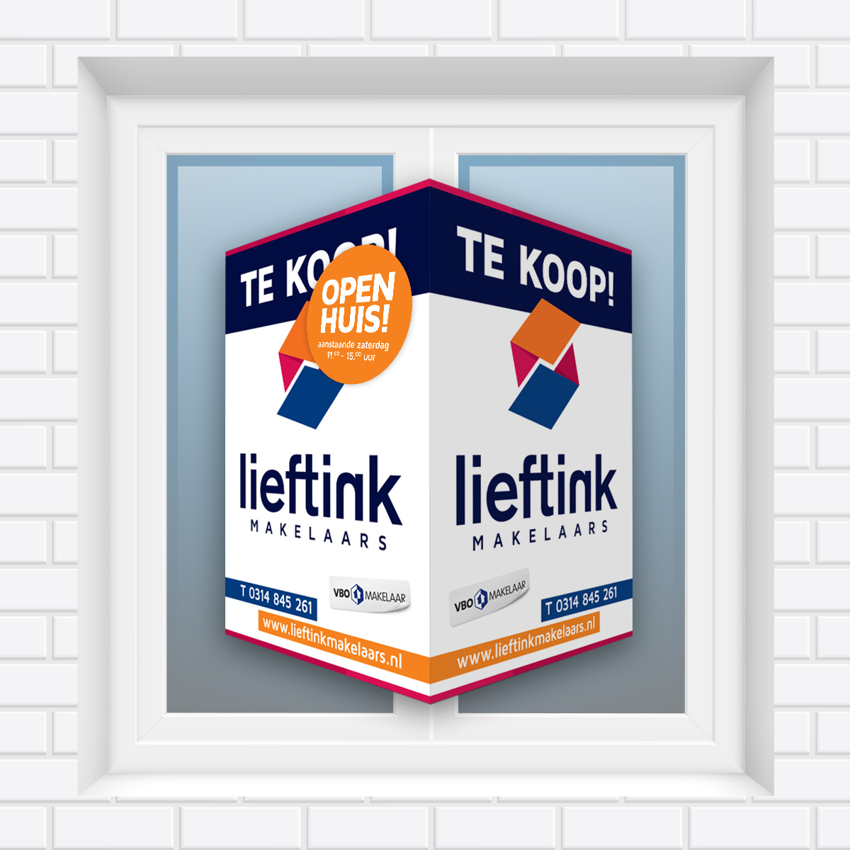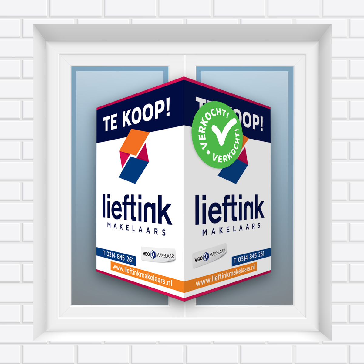 Makelaars zijn dol op V-borden, om op eenvoudige wijze hun ’te koop’ op een woning te bevestigen. lekker in vorm mocht een ontwerp ervan in de nieuwe huisstijl verzorgen. Handige toevoegingen: door middel van kleine, ronde statische stickers kan een gewijzigde verkoopstatus of open dag eenvoudig gecommuniceerd worden op hetzelfde bord, zonder bang te hoeven zijn voor beschadigingen bij verwijdering.