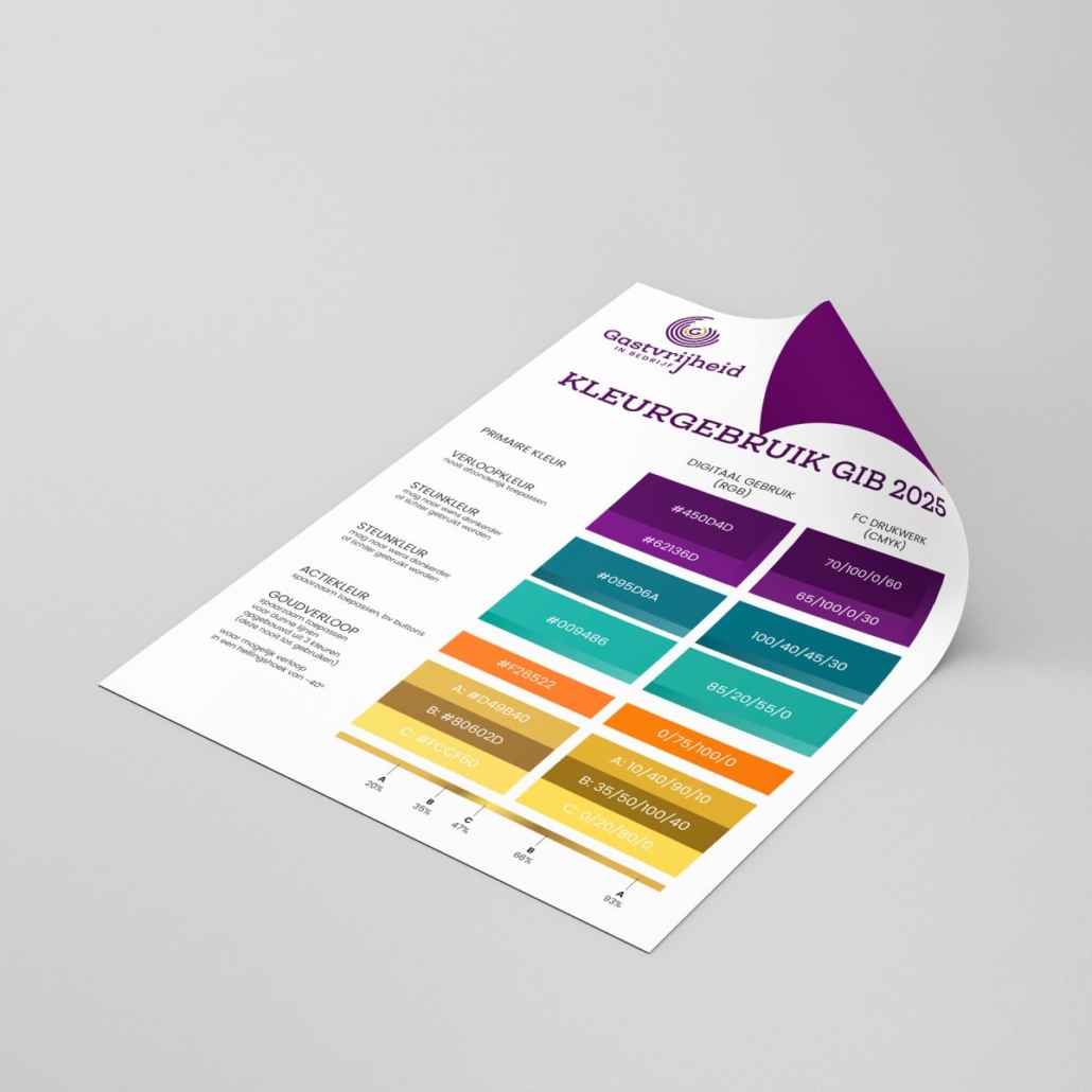 We hebben het aantal huisstijlkleuren teruggebracht voor rust en gebruiksgemak: het primaire paars is dieper en statiger geworden, terwijl het secundaire oranje voortaan alleen nog voor actiematige accenten wordt ingezet. Daarnaast zorgt een goudverloop in smalle belijning voor een nog verfijndere uitstraling. Tot slot kozen we twee turkooiskleuren die in diverse tinten ondersteunend gebruikt mogen worden.