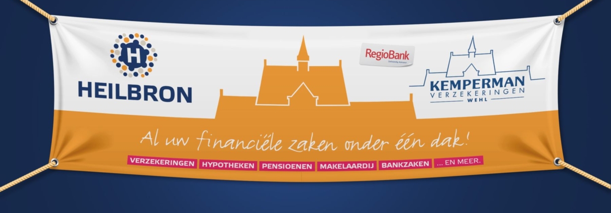 Heilbron Wehl en Kemperman Verzekeringen zitten samen in één pand en slaan de handen ineen om lokale evenementen te sponsoren, zoals het Dorpsfeest en de Wehleriade. Bij lekker in vorm gebruikten we de gemeenschappelijke vestigingsplek – het oude gemeentehuis van Wehl – als uitgangspunt voor een gecombineerd spandoek, een advertentie en een geldvangcertificaat voor een stand-actie.