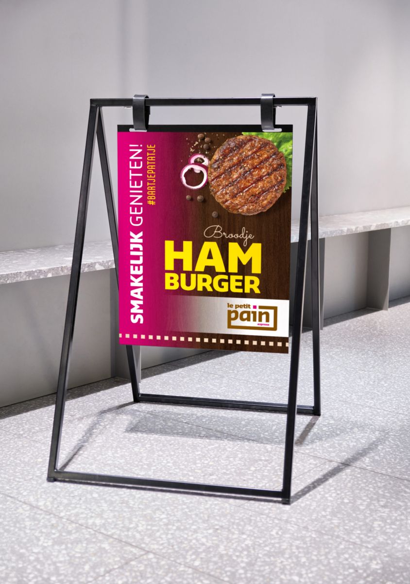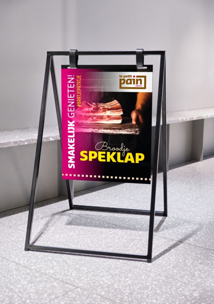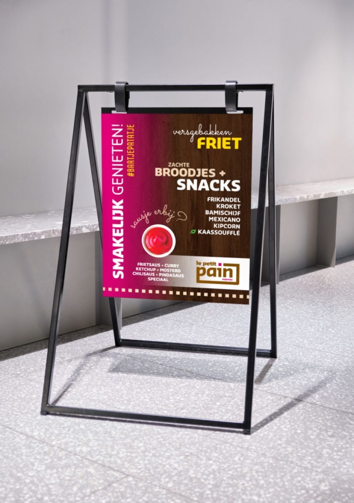 Voor Le Petit Pain Express – de mobiele snackwagen van de Doetinchemse lunchroom – ontwierpen we bij lekker in vorm deze handige magnetische menuborden. Handig zelf te plaatsen én te wisselen op een stalen stoepbord frame, precies afgestemd op wat er op dat moment op het menu staat.