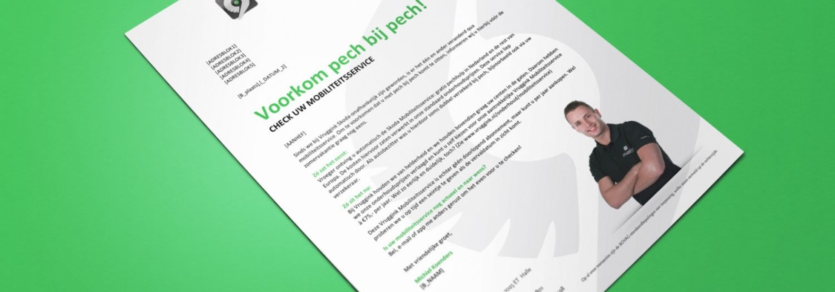 Wel of niet verzekerd bij pech? Klanten van Autobedrijf Vruggink kregen een heldere brief op de mat, waarin ze aangemoedigd werden de status van hun mobiliteitsservice vóór de vakantie nog even te checken. Bij lekker in vorm schreven we de teksten en verzorgden we de opmaak, waarna de medewerkers van Vruggink zelf de gepersonaliseerde brieven konden printen via hun eigen softwareprogramma.