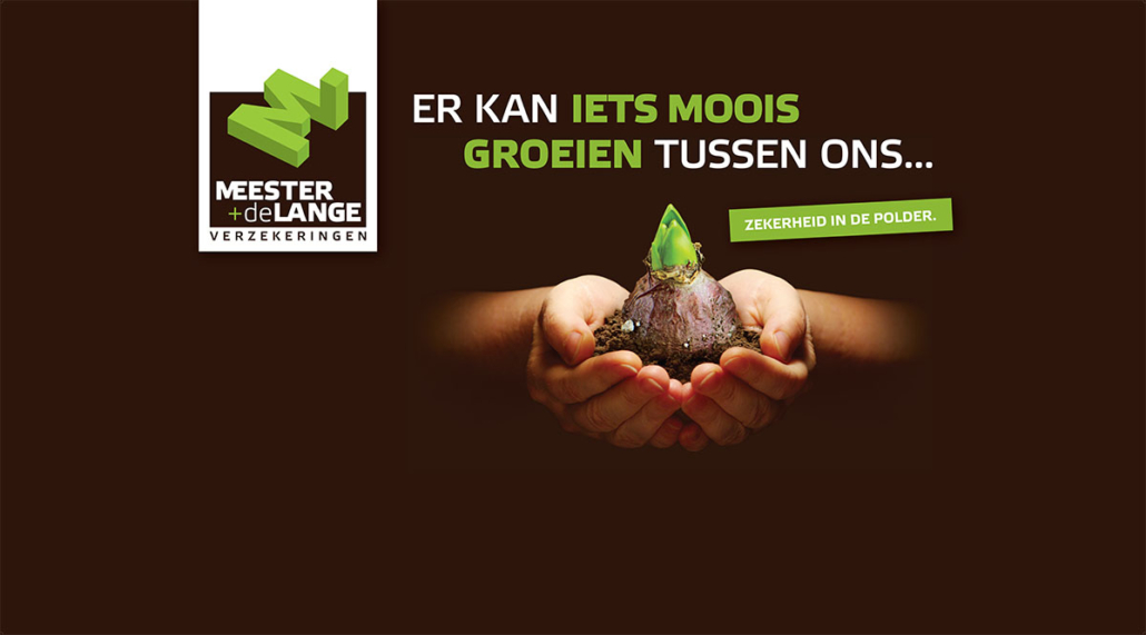 Speciaal voor de Bloembollen Vakdagen mocht lekker in vorm voor de beursstand van Meester & De Lange Verzekeringen een mooie beurswand en bijpassende desk ontwerpen. Het thema groei stond centraal, vandaar de slogan ‘Er kan iets moois groeien tussen ons…’. Leuk detail: de wand wordt opgebouwd uit meerdere, verticale magneetstroken. We hebben hier bij de vormgeving rekening mee gehouden, zodat het logo nu zowel links als rechts van de afbeelding geplaatst kan worden, afhankelijk van de looprichting.