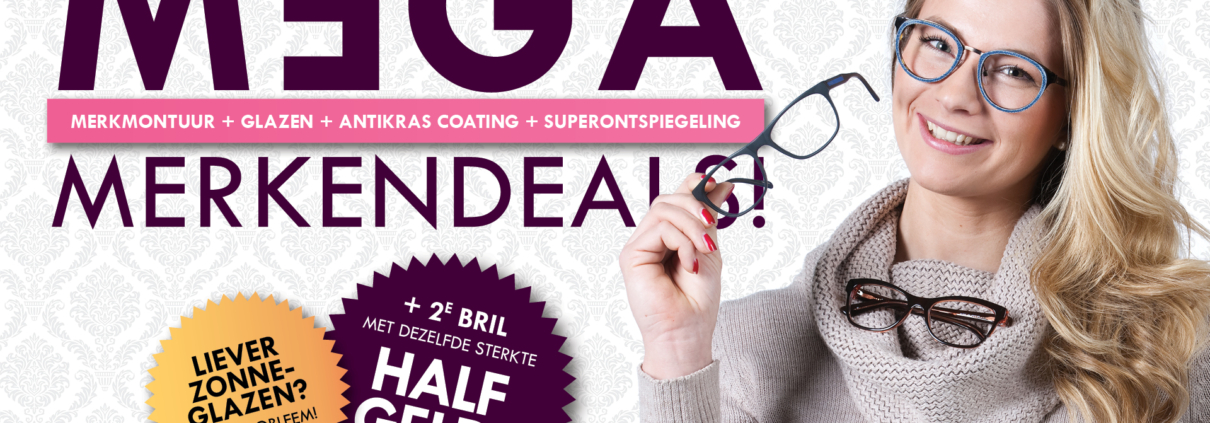Ook dit jaar heeft bril-in-mode weer keihard onderhandeld: tijdens de Mega Merkendeals zijn er daarom vier topmerken te koop voor bodemprijzen. De campagne wordt uitgebreid onder de aandacht gebracht middels een huis-aan-huis folder gevouwen in kruisslag, advertentie en diverse items in en rondom de winkel en online.