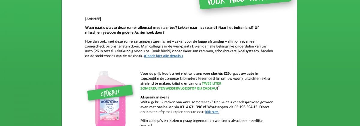 In welke staat ga jij met je auto de zomer in? Via een nieuwsbrief naar klanten brengt Autobedrijf Vruggink de handige zomercheck onder de aandacht. Bij lekker in vorm schreven we de teksten en maakten we de diverse visuele elementen, waarna de medewerkers van Vruggink zelf de mailing konden samenstellen in hun eigen softwareprogramma.