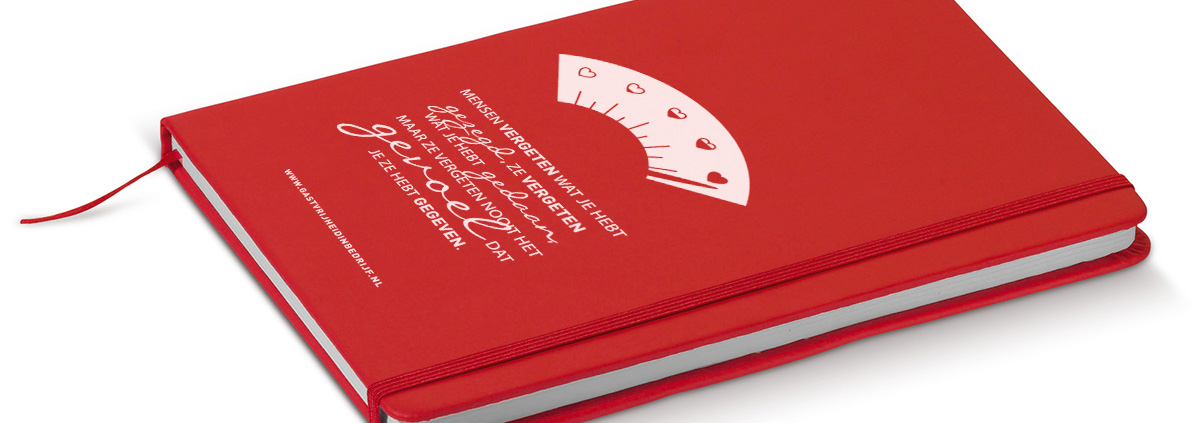 Alle inspiratie die je opdoet bij de gastvrijheidtrainingen bij Gastvrijheid in Bedrijf moet natuurlijk wel een plekje kunnen krijgen. Daarom stelde lekker in vorm voor om naast het bestaande notitieblok ook dit handzame notitieboekje (A6) aan de huisstijllijn toe te voegen. Dat voorstel viel in de smaak, dus regelden we de opmaak van een mooie quote in één kleur op de stoffen cover.