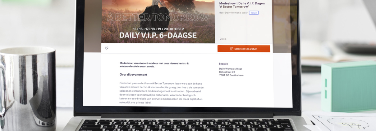 Om de aangepaste V.I.P. dagen met hun vele modeshows en aangescherpte coronaregels in juiste banen te leiden, mochten we bij lekker in vorm het online gratis ticketysteem Eventbrite inrichten voor Daily Women’s Wear. De beschikbaarheid van elke modeshow is hier voor klanten makkelijk online inzichtelijk gemaakt en de gratis kaartjes met QR-code kunnen zonder tussenkomst van de winkel aangeschaft worden. Bovendien staan de bezoekersgegevens meteen goed geregistreerd volgens de huidige richtlijnen. De eventpagina hebben we tot slot mooi aangekleed met duidelijke teksten en sfeerbeeld en gepromoot via een nieuwsbrief, de website van Daily zelf en social media.