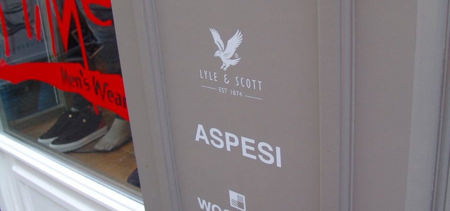 T-Time Men’s Wear heeft er enkele mooie merken bij! Woolrich, Mason Garments, Lyle Scott, C.P. Company en Emporio Armani kregen een mooi plaatsje bij de bestaande merken op de pui. Wederom uitgevoerd in reflecterende folie.