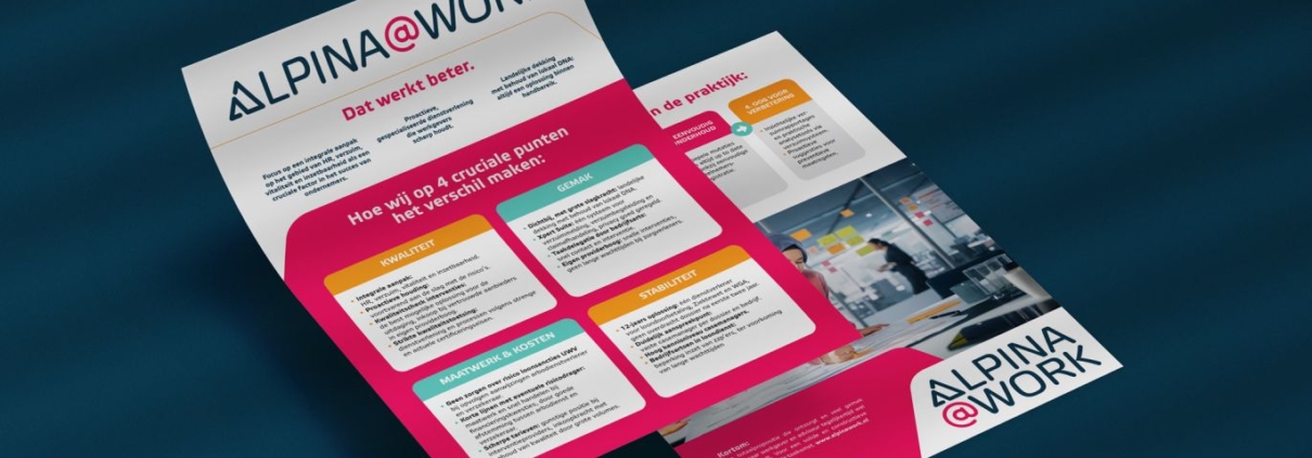 Om als adviseur tijdens een verkoopgesprek een visuele leidraad te hebben, mochten we bij lekker in vorm deze pitchkaart vormgeven over de pluspunten van Alpina@Work. Door de verzorgde opmaak kan de kaart na afloop van het gesprek ook prima bij de klant achterblijven om nog eens rustig nagelezen te worden.