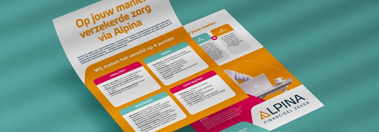 Om als adviseur tijdens een verkoopgesprek een visuele leidraad te hebben, mochten we bij lekker in vorm deze pitchkaart vormgeven over de pluspunten van Alpina. Door de verzorgde opmaak kan de kaart na afloop van het gesprek ook prima bij de klant achterblijven om nog eens rustig nagelezen te worden.