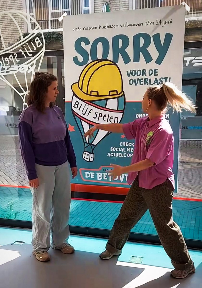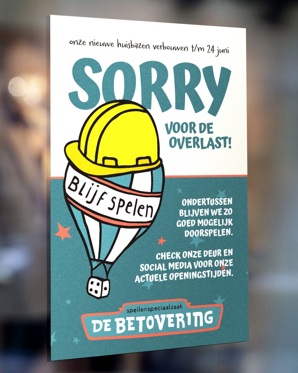 Om aan klanten alvast sorry te zeggen, mochten we bij Lekker in Vorm deze extra grote verbouwingsposter ontwerpen. De herkenbare ballon uit de huisstijl kreeg voor de gelegenheid een bouwhelm op.