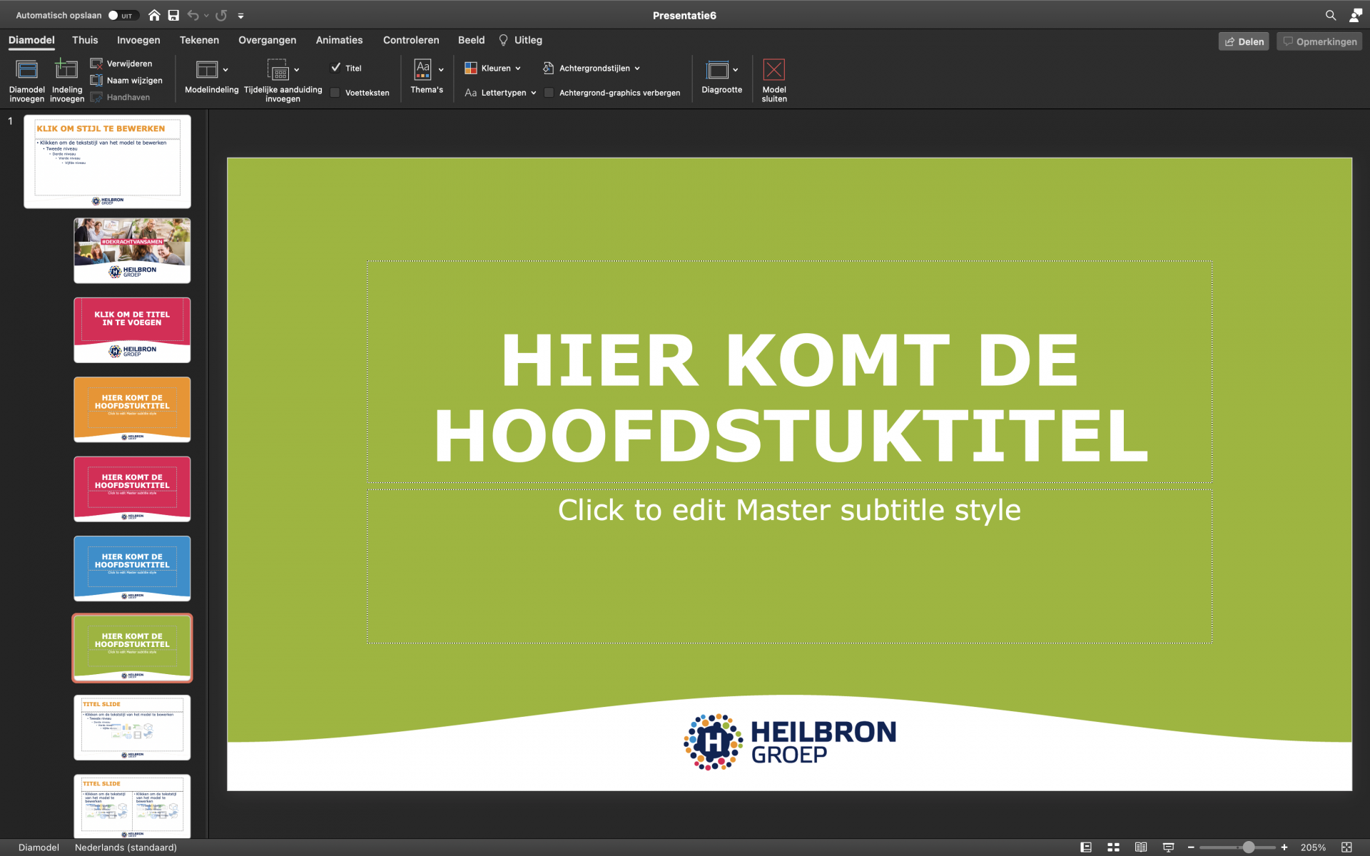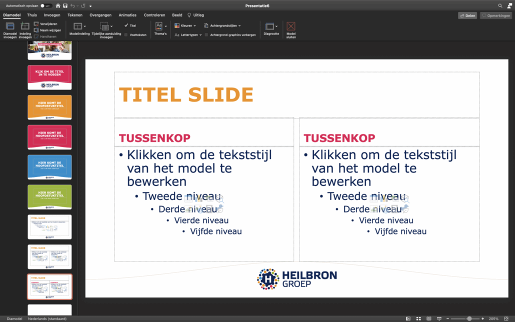 Het maken van een mooie PowerPoint presentatie binnen de huisstijl is voor iedere medewerker van de Heilbron Groep mogelijk, dankzij dit handige PowerPoint sjabloon met diverse voor-ontworpen pagina’s en alineastijlen.