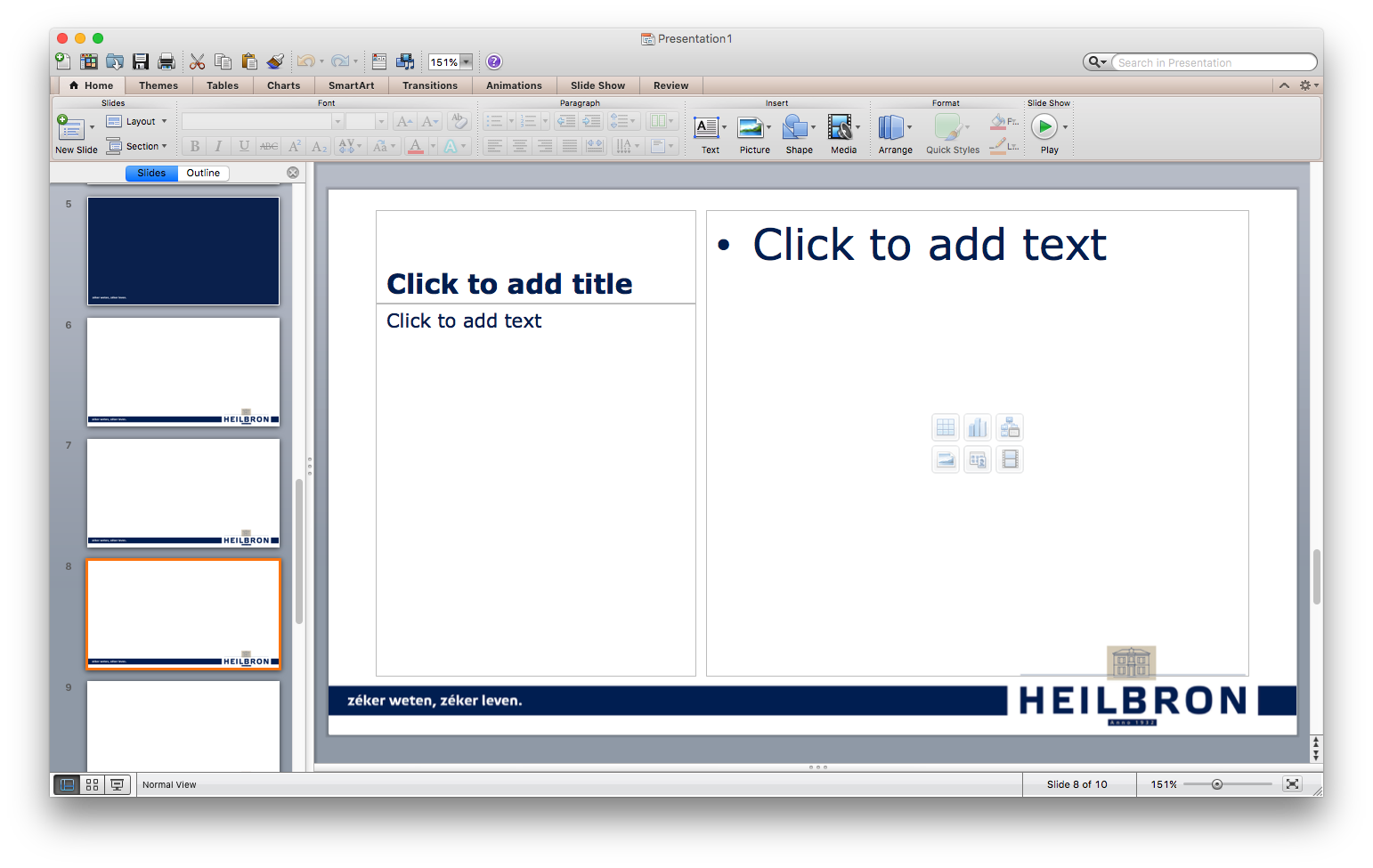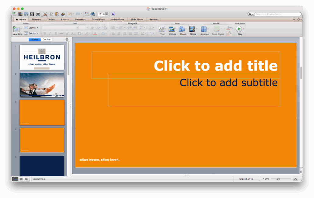 Het maken van een mooie PowerPoint presentatie binnen de huisstijl is nu voor elke medewerker van Heilbron een eitje, dankzij dit handige PowerPoint sjabloon met diverse voor-ontworpen pagina’s en alineastijlen.