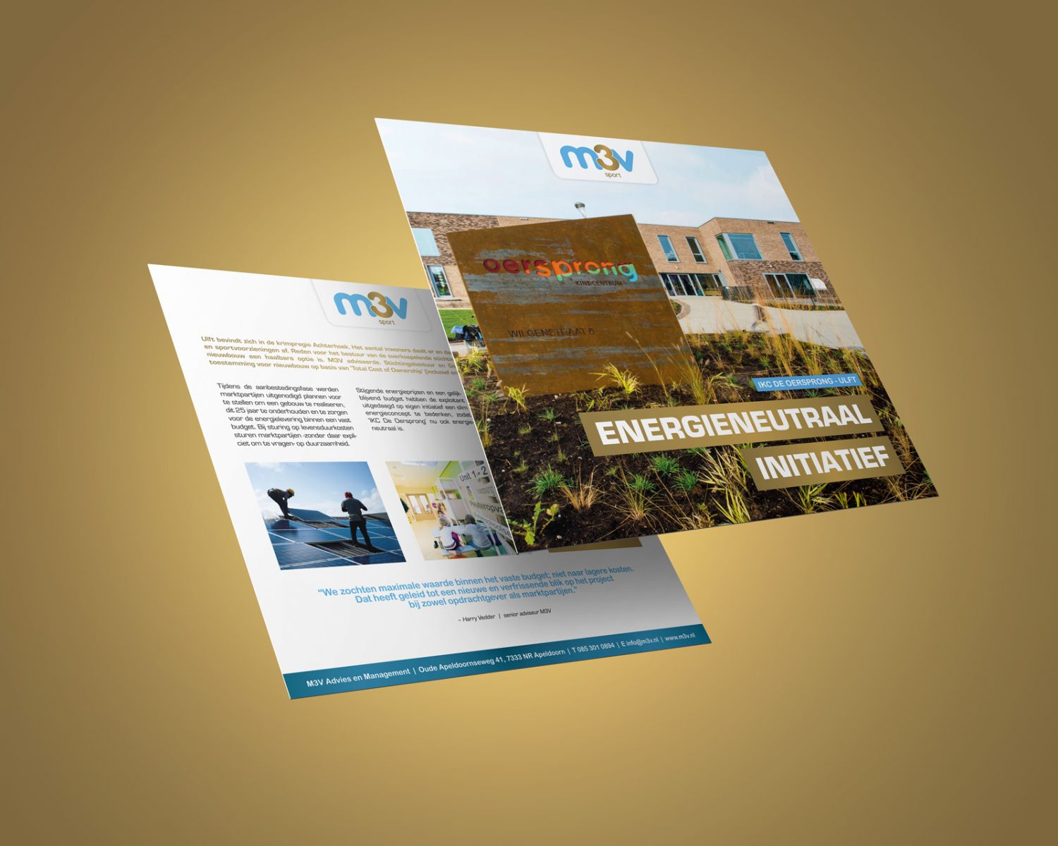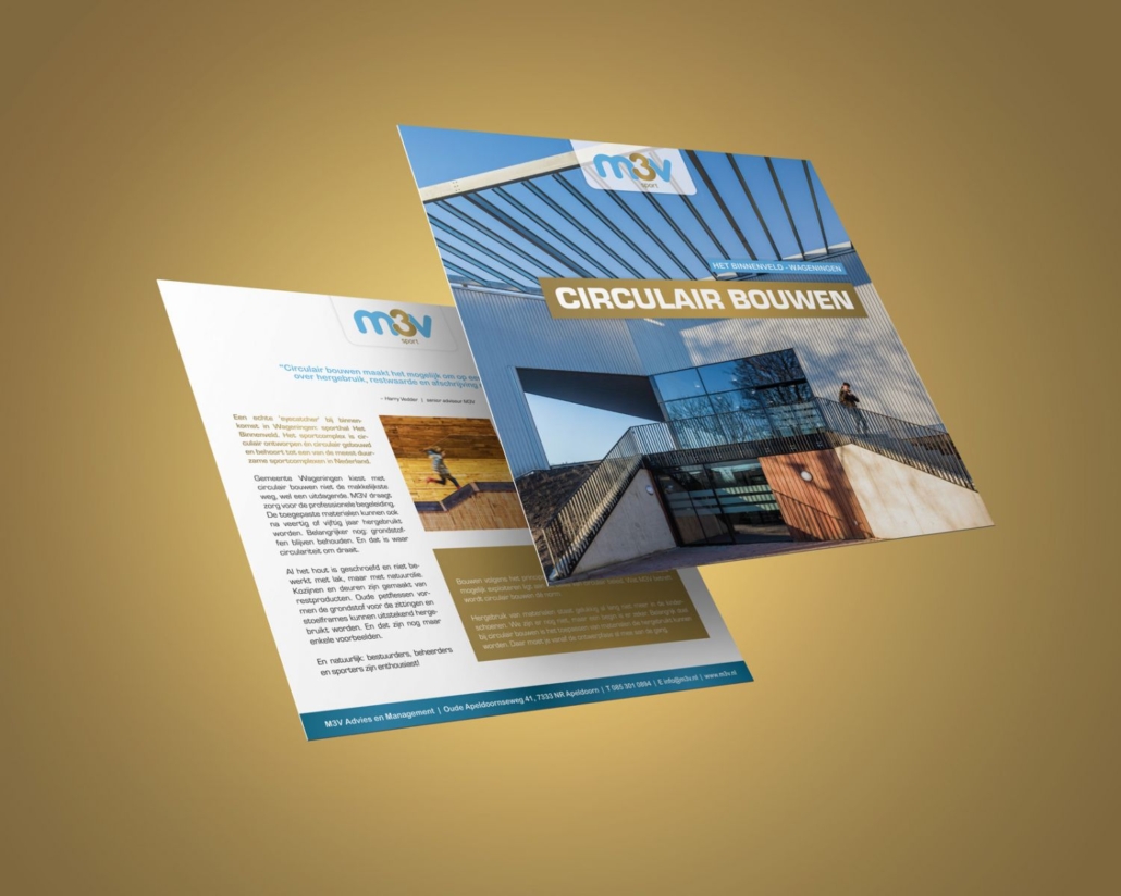Compact en dus handig om weg te geven op diverse beursen: deze vierkante projectbladen van M3V met elk een eigen thema. Bij lekker in vorm verzorgden we de opmaak ervan.