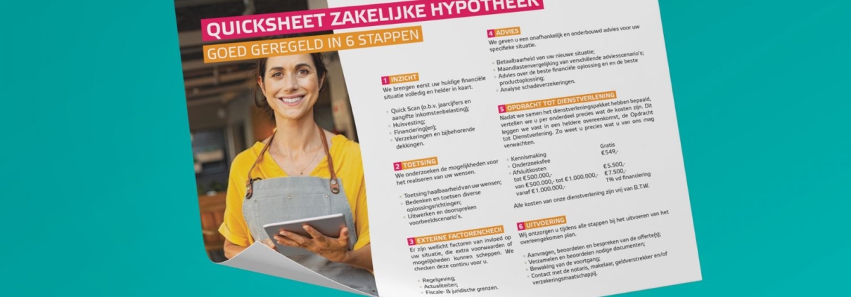 Een zakelijke hyptheek afsluiten? Adviseurs van Heilbron kunnen je aan de hand van een quicksheet snel laten zien hoe dat in zijn werk gaat. Prettig als leidraad in een persoonlijk gesprek en daarna voor de klant om alles nog eens rustig na te lezen. Bij lekker in vorm mochten we de vormgeving ervan bedenken, inclusief een overzichtelijke manier om alle geldverstrekkers te tonen.