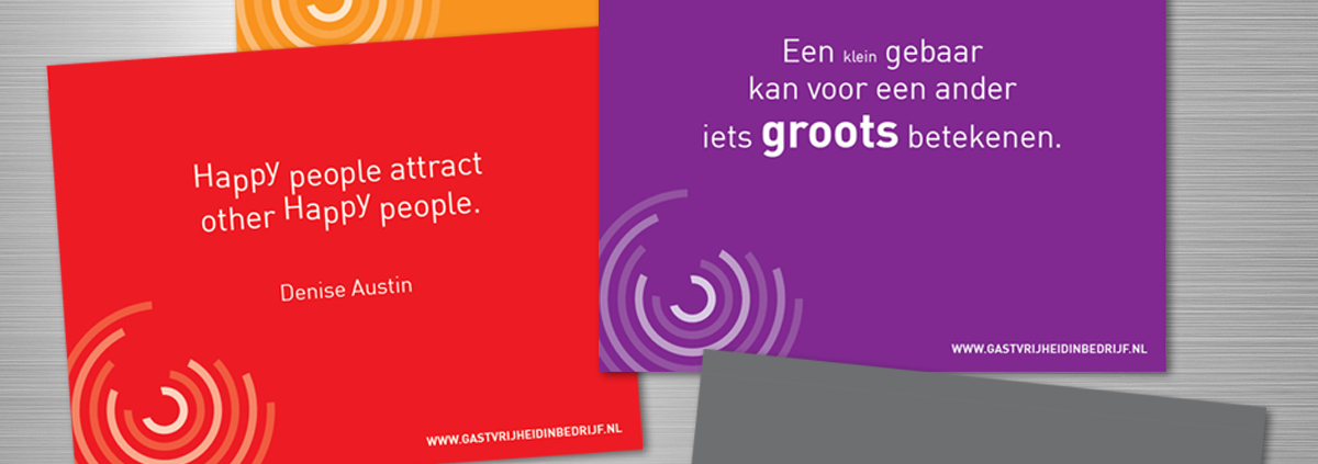Via inspirerende quotes moedigt Gastvrijheid in Bedrijf iedereen aan om complimenteuzer en gastvrijer te zijn. De quotes verschijnen op social media en zijn als sets te bestellen in gedrukte vorm. Er verschijnen regelmatig nieuwe varianten. lekker in vorm maakt deze quotes op binnen de huisstijl en voorziet ze geregeld van simpele maar doeltreffende speelsheden.