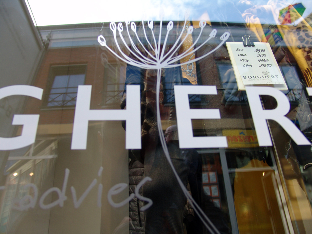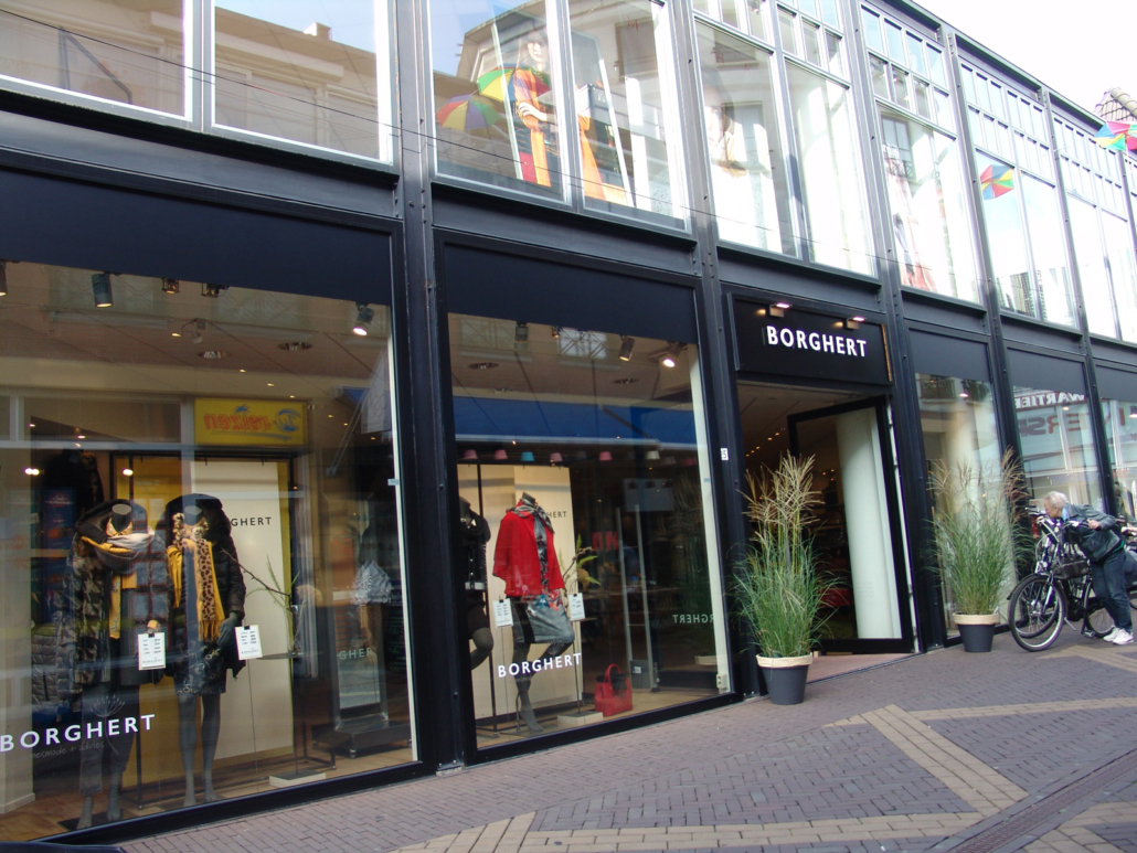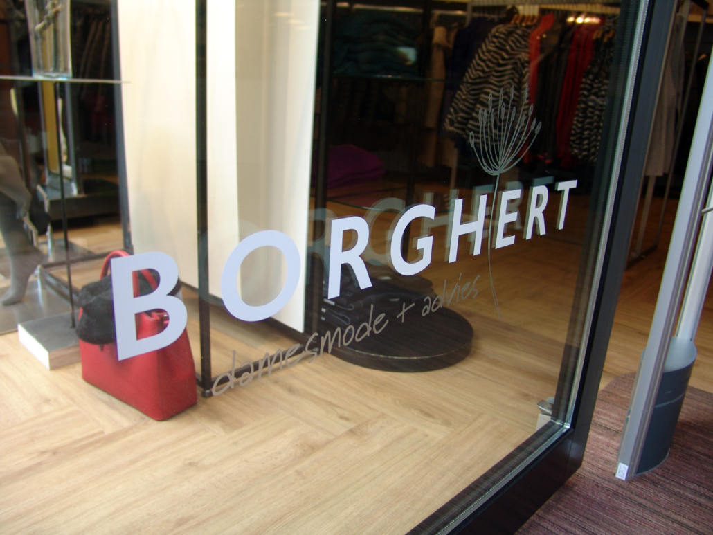 Subtiel maar herkenbaar: voor de brede pui van damesmodezaak Borghert aan de Catharinastraat in Doetinchem mochten we bij lekker in vorm deze raambelettering met glasetch folie en witte folie ontwerpen en laten uitvoeren.
