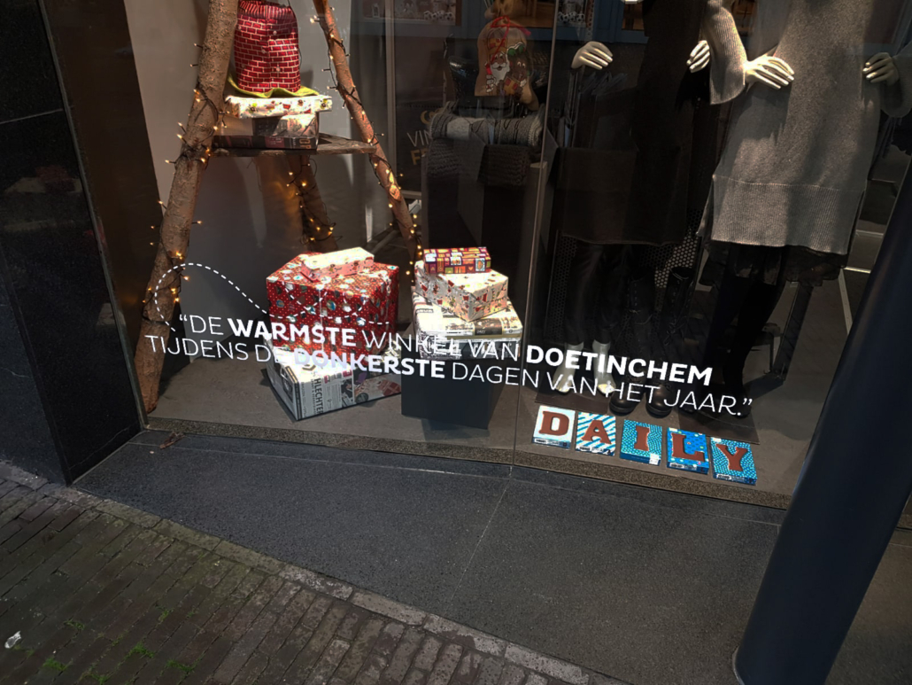Met de leus ‘De warmste winkel van Doetinchem tijdens de donkerste dagen van het jaar’ heet Daily women’s wear iedereen de komende weken warm welkom in de sfeervolle winkel aan de Boliestraat in Doetinchem. De tijdelijke raambelettering wordt verder ondersteund met een sfeervolle roll-up banner.