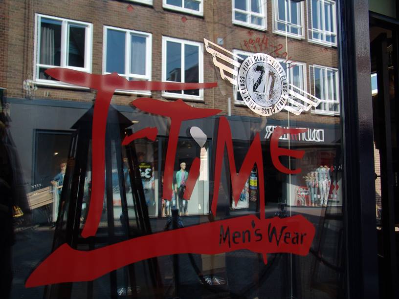 In het kader van het feestelijke jubileumjaar kon de pui van T-Time men’s wear wel wat extra attentiewaarde gebruiken. lekker in vorm voorzag de diverse etalageruiten daarom van het jubileumlogo, gedeeltelijk uitgevoerd in sterk spiegelende folie.