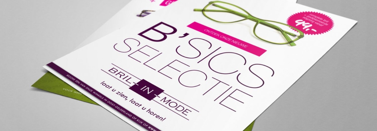 Introduceerden we de nieuwe B’SICS monturen van Bril-in-Mode enkele maanden geleden al stevig met een reclamecampagne, dit kwartaal doen we het nog even dunnetjes over via een dubbelzijdige repeatflyer met daarin de belangrijkste voordelen van een B’SICS montuur op een rijtje.
