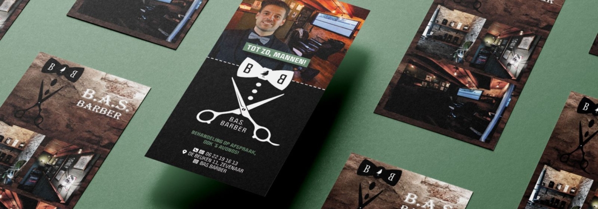 Na restyling van zijn logo mochten we ook de flyer / prijslijst van Bas Barber onder handen nemen. Zijn gezicht en salon kregen hierop een meer prominente plek, voor herkenbaarheid en laagdrempeligheid. Daarnaast dachten we kritisch met Bas mee over een duidelijke indeling van zijn prijzen en een opvallende plek voor zijn kennismakingsactie. Uiteindelijk hebben we de flyer op lekker stevig papier laten drukken, zodat deze qua uitstraling past bij de kwaliteit van de salon.