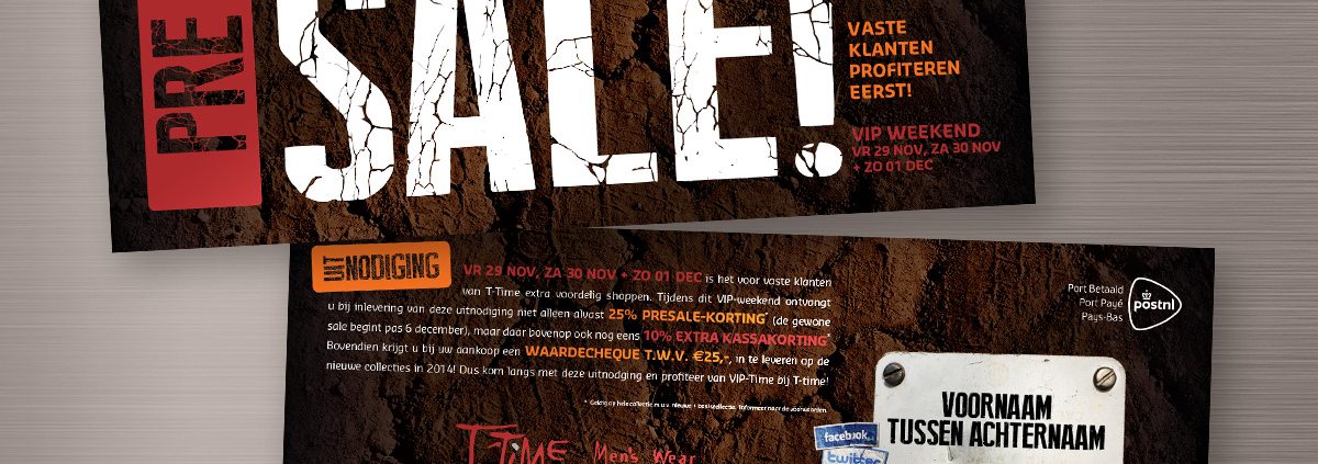 T-Time men’s wear benaderde lekker in vorm met het verzoek om zijn jaarlijkse salecampagne eens in een nieuw jasje te steken, zonder hierbij aan herkenbaarheid in te boeten. lekker in vorm voorzag de nieuwe direct mailing van een stoer, onderscheidend lettertype dat naadloos aansluit op de doelgroep en de gevoerde kledingmerken. Daarnaast zorgde het ombouwen van het standaard A5 formaat naar een langergerekte variant met dezelfde grootte voor extra opvalwaarde in de de brievenbus. Ook de ruimte voor het inprinten van de adresgegevens kreeg een creatieve invulling met metaal-look. Ten slotte zorgde lekker in vorm voor een bijpassend stoepbord en zo was T-Time helemaal klaar voor de sale nieuwe stijl.