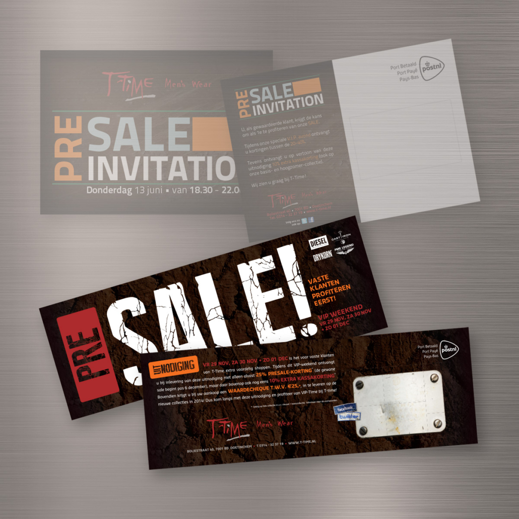 T-Time men’s wear benaderde lekker in vorm met het verzoek om zijn jaarlijkse salecampagne eens in een nieuw jasje te steken, zonder hierbij aan herkenbaarheid in te boeten. lekker in vorm voorzag de nieuwe direct mailing van een stoer, onderscheidend lettertype dat naadloos aansluit op de doelgroep en de gevoerde kledingmerken. Daarnaast zorgde het ombouwen van het standaard A5 formaat naar een langergerekte variant met dezelfde grootte voor extra opvalwaarde in de de brievenbus. Ook de ruimte voor het inprinten van de adresgegevens kreeg een creatieve invulling met metaal-look. Ten slotte zorgde lekker in vorm voor een bijpassend stoepbord en zo was T-Time helemaal klaar voor de sale nieuwe stijl.