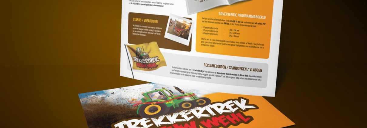 Om sponsoren te enthousiasmeren en informeren over de Trekkertrek Nieuw Wehl mochten we bij lekker in vorm de bestaande sponsorflyer in een nieuw jasje gieten. We kozen voor een liggende uitvoering en 2 versies (tarieven + specificaties) om alles overzichtelijk en wervend in beeld te brengen op een zakelijke maar toegankelijke manier.