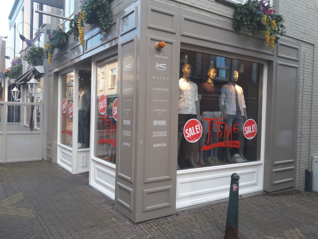 Deze raamstickers voor de sale van T-Time men’s wear zijn uitgevoerd in bubble free folie: eenvoudiger te plakken, makkelijker te verwijderen en als je er netjes mee omgaat zelfs te hergebruiken. Bij lekker in vorm regelden we zowel materiaaladvies als vormgeving en uitvoering.