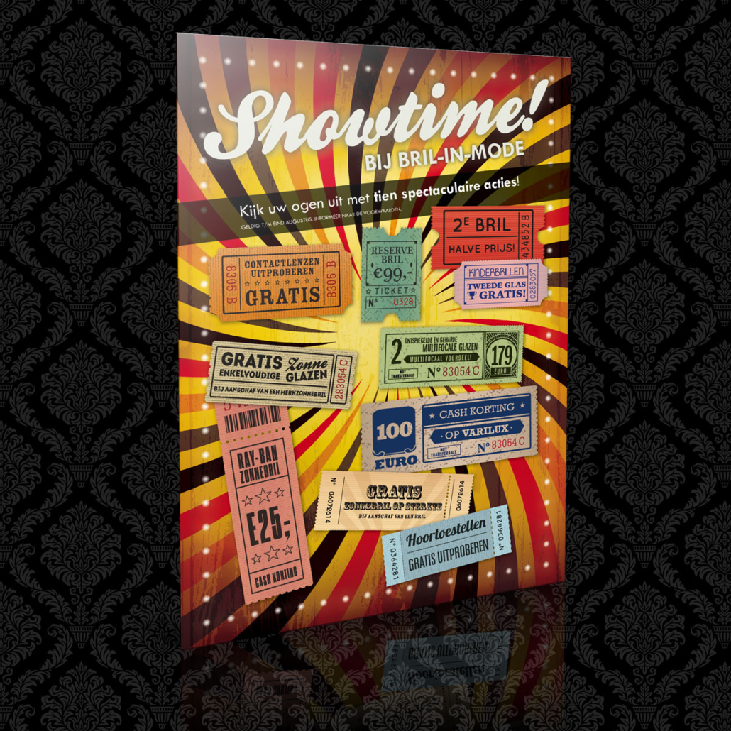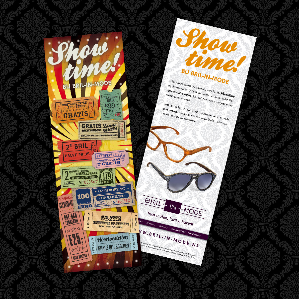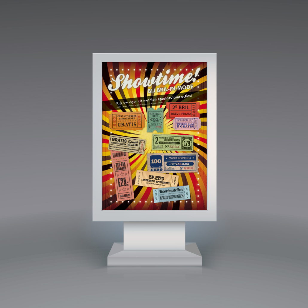 Je kijkt deze zomer je ogen uit, want het is Showtime bij Bril-in-Mode! Met keuze uit maar liefst tien spectaculaire acties. Bepaal zelf welke volgens ú het meest de show steelt. De campagne wordt uitgebreid onder de aandacht gebracht middels een direct mailing (presale) naar vaste klanten, huis-aan-huis flyers, advertenties en diverse items in en rondom de winkel.