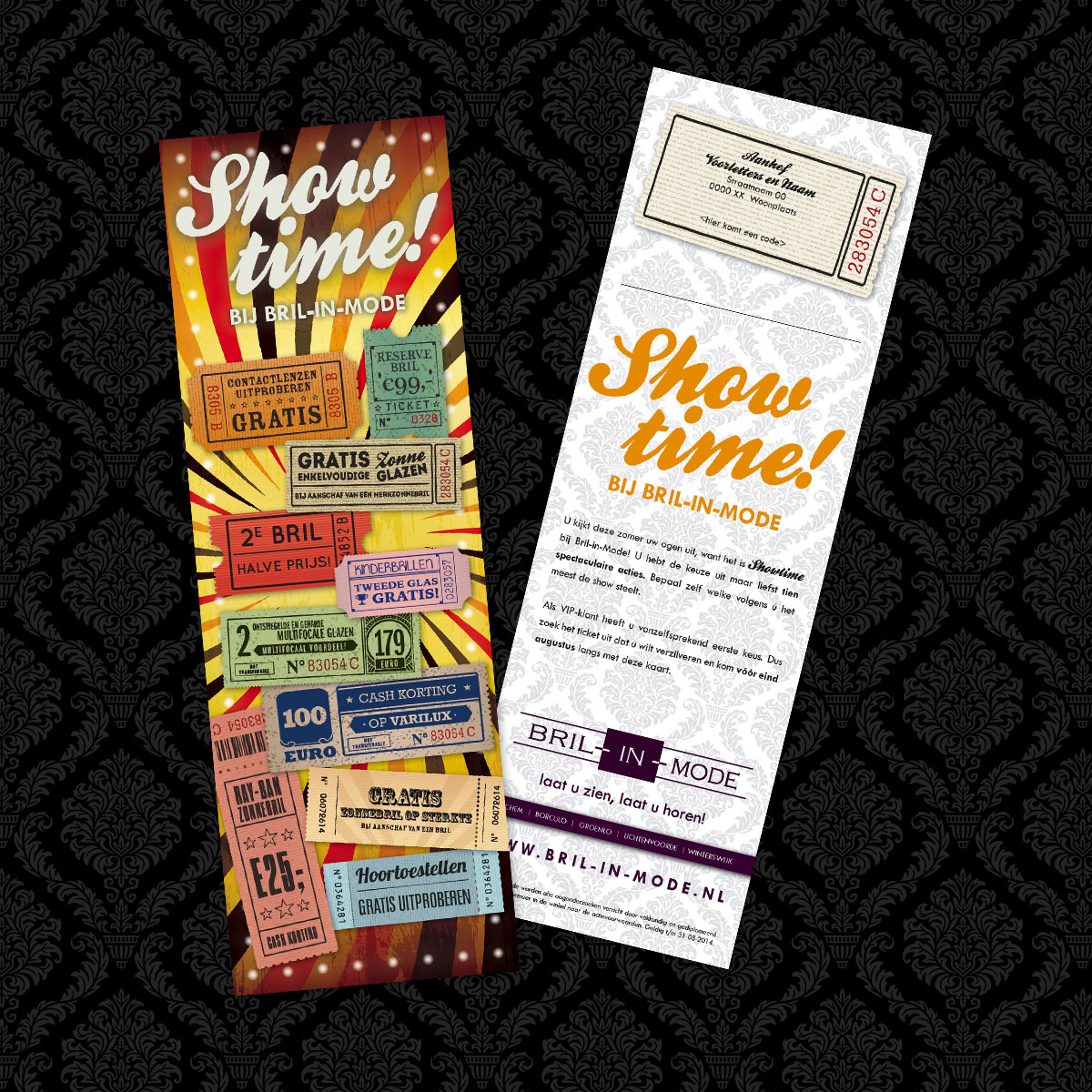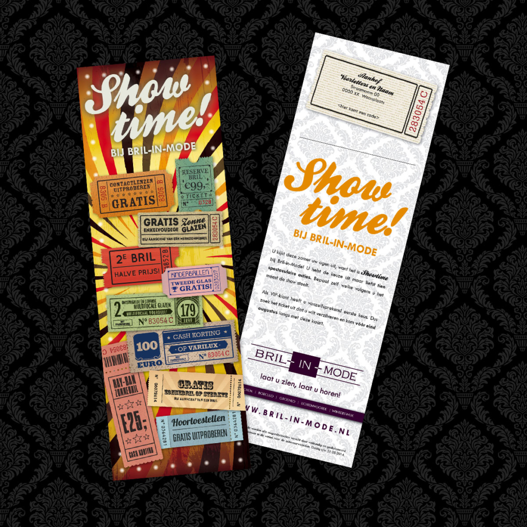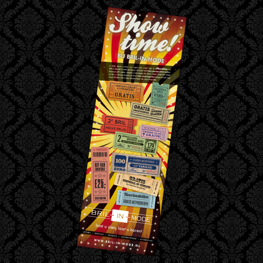 Je kijkt deze zomer je ogen uit, want het is Showtime bij Bril-in-Mode! Met keuze uit maar liefst tien spectaculaire acties. Bepaal zelf welke volgens ú het meest de show steelt. De campagne wordt uitgebreid onder de aandacht gebracht middels een direct mailing (presale) naar vaste klanten, huis-aan-huis flyers, advertenties en diverse items in en rondom de winkel.