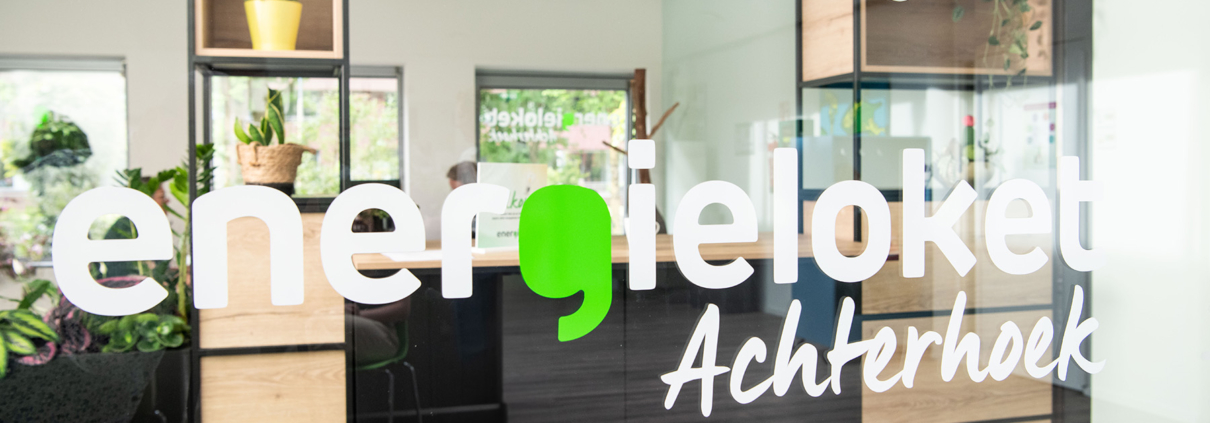 Binnen in de algemene hal zorgt een pijl boven de binnendeur voor een subtiele, maar duidelijke nudge richting het Energieloket. Op het binnenraam combineren we het logo met vrolijke iconen rondom wonen, besparen en energie. Dat maakt het loket niet alleen herkenbaar, maar ook toegankelijk en laagdrempelig. Een welkomstbordje maakt het plaatje compleet.