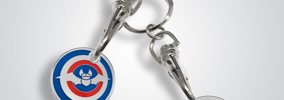 Guanokalong / GK-Organics geeft haar relaties een handige give-away: een sleutelhanger met musketonhaak en winkelwagenmuntje, uitgevoerd in diepdruk. De ingeslagen onderdelen zijn vervolgens ingelakt met gekleurde soft emaille.