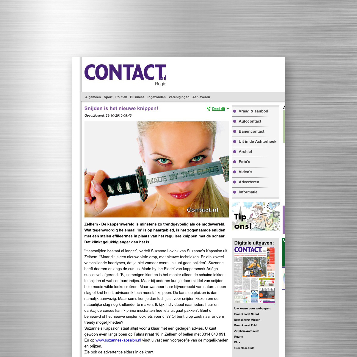 Suzanne heeft de cursus ‘Made by the Blade’ van kappersmerk Artègo succesvol afgerond. Om dit kenbaar te maken aan de buitenwereld schreef lekker in vorm een persbericht en voorzag deze van een bijpassende afbeelding. Het is uiteindelijk o.a. geplaatst in het plaatselijke weekblad Contact, zowel online als offline.