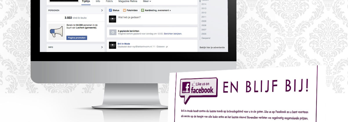 Ook online is Bril-in-Mode zichtbaar aanwezig, onder ander op social media als Facebook en Youtube. lekker in vorm verzorgt de vormgeving van sfeervolle, actuele headers en diverse posts, plus offline media die mensen wijzen op het bestaan van de Bril-in-Mode accounts.